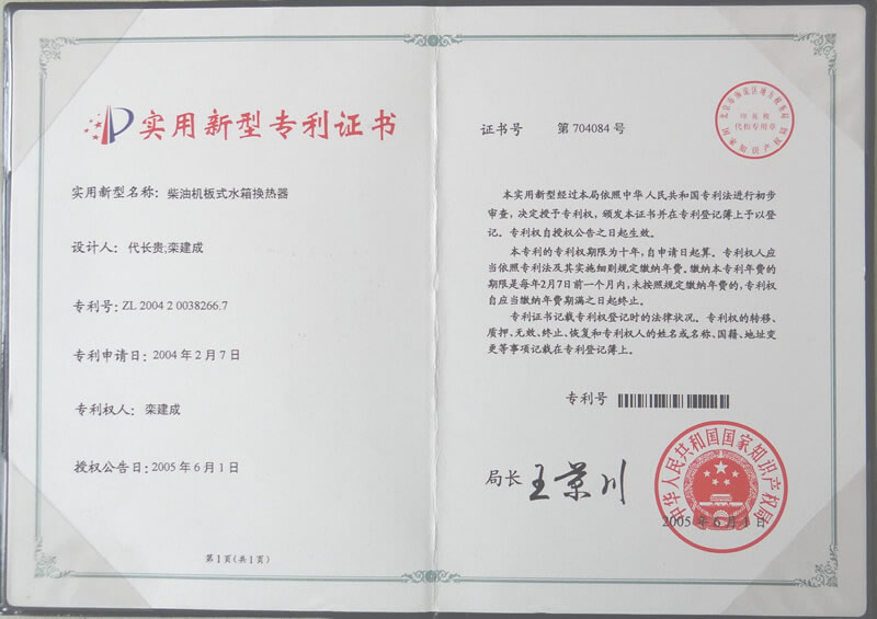 Diesel engine plate type water tank heat exchanger - utility model patent certif